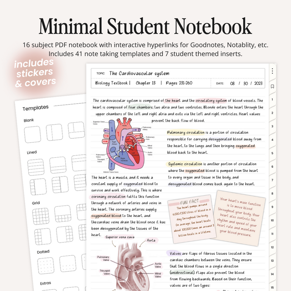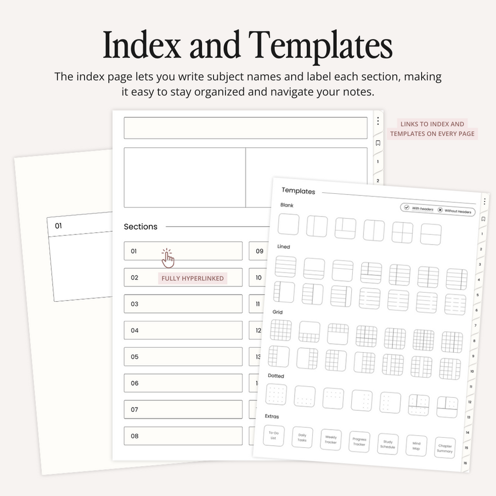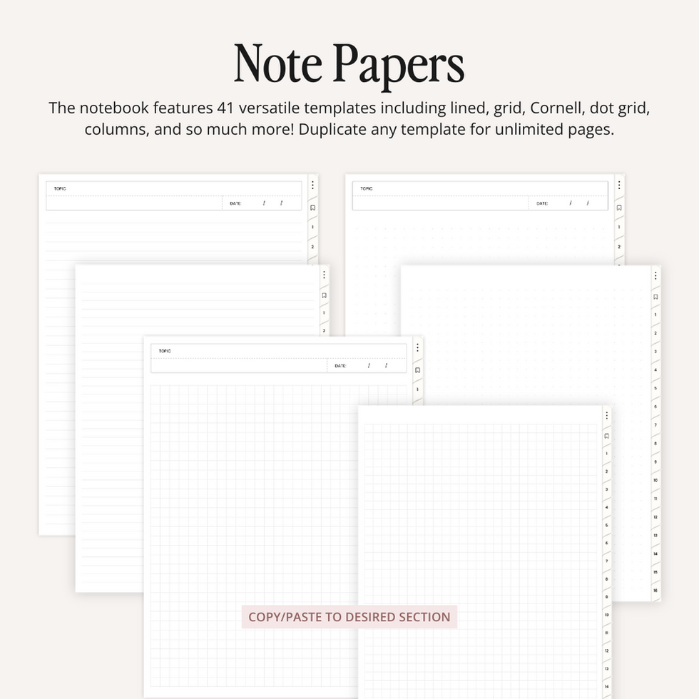 Introducing the Minimalist Student Digital Notebook with 41 templates (each with and without headers for seamless note-taking) and 16 subject sections—perfect for customizing to your academic or personal needs. Note templates include lined, grid, dot grid, blank, Cornell notes, two-column, three-column, and more. It also features functional student inserts like a To-Do List, Weekly Tracker, Progress Tracker, Study Schedule, Mind Map, Chapter Summary, and Daily Tasks to support your digital planning.