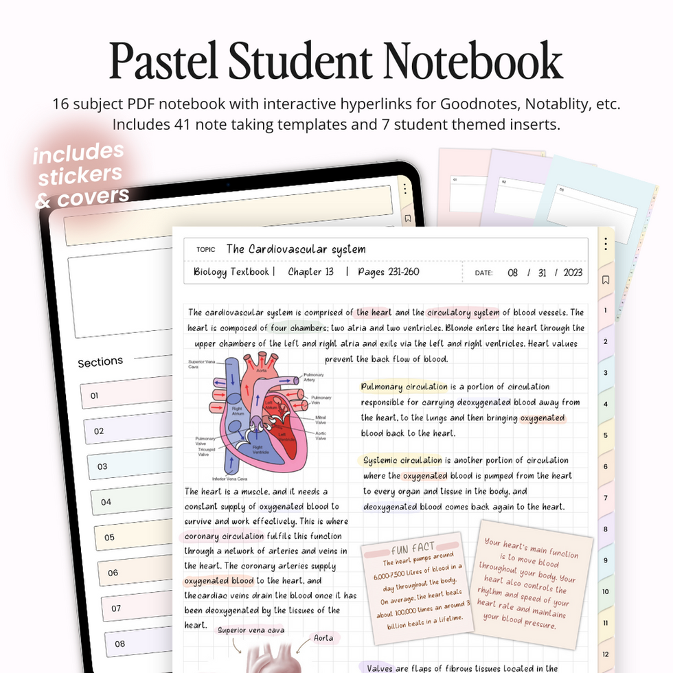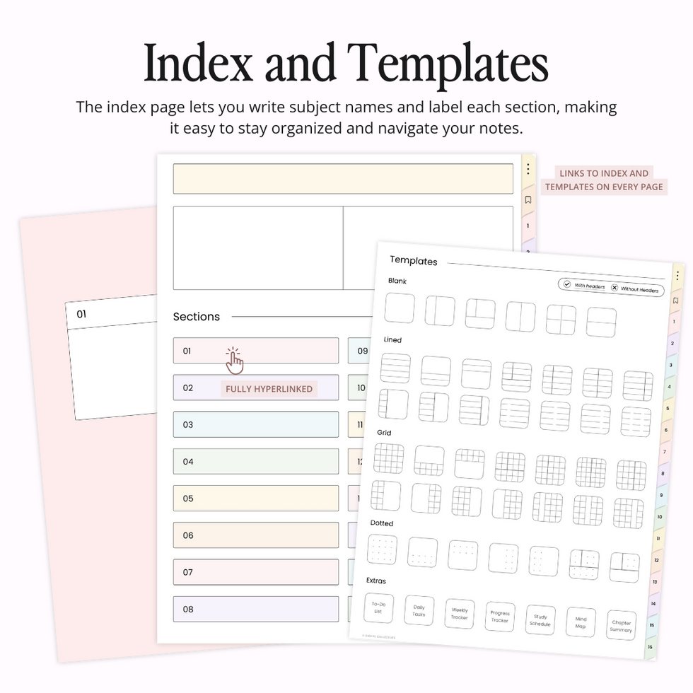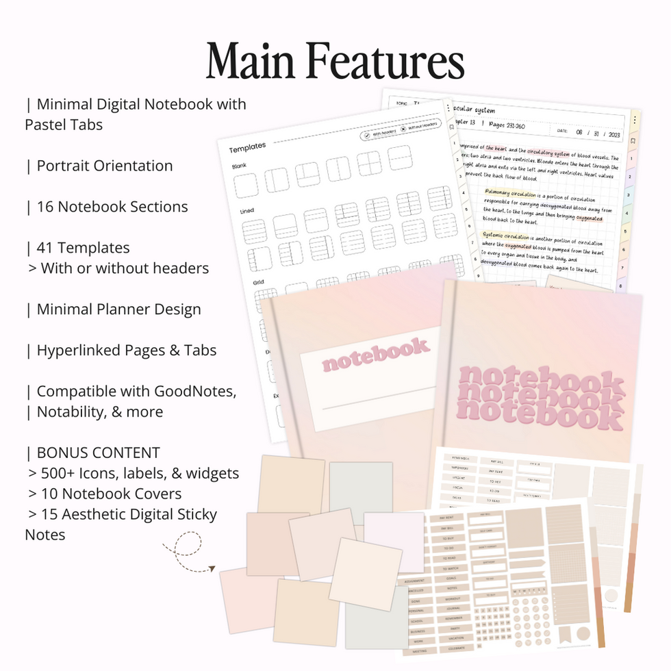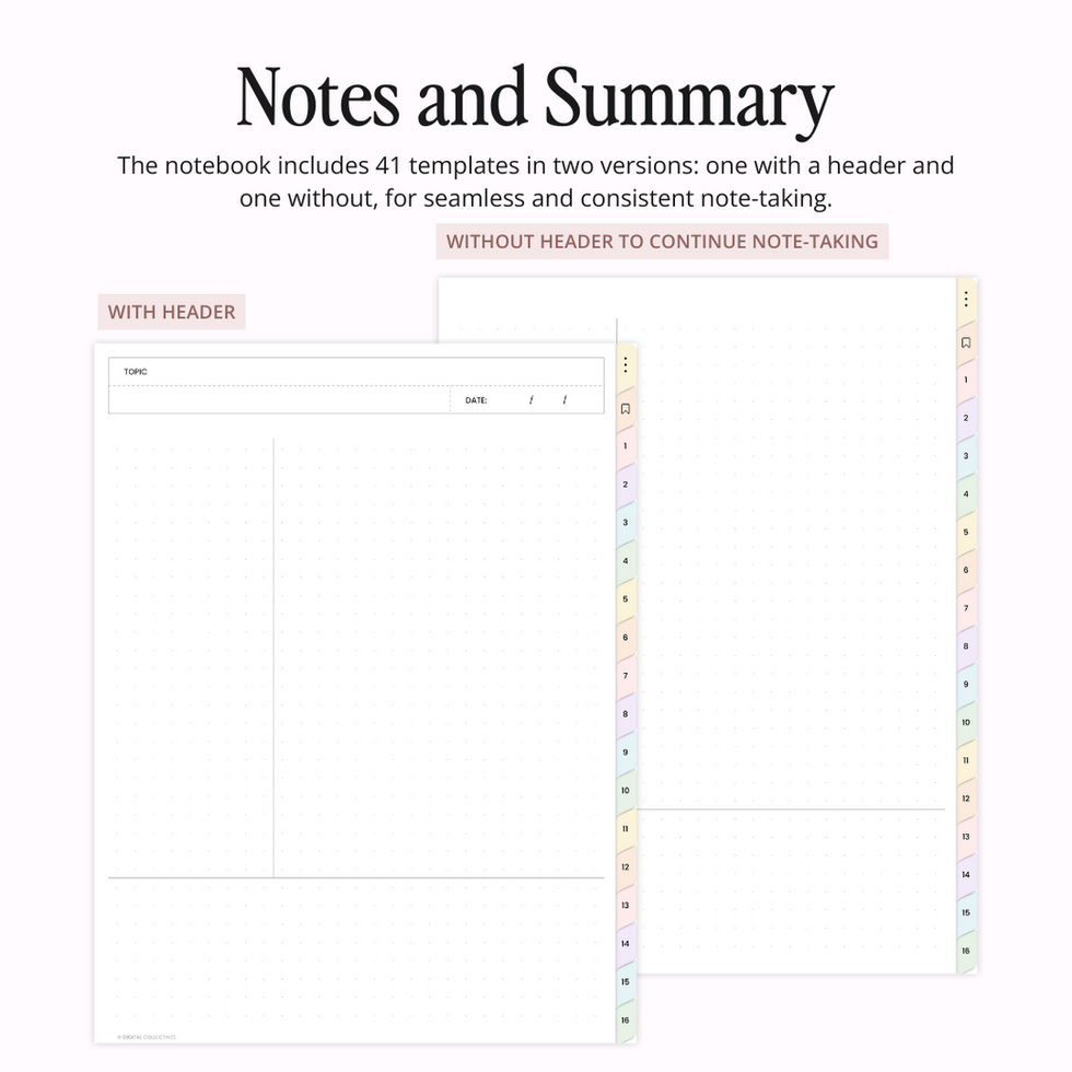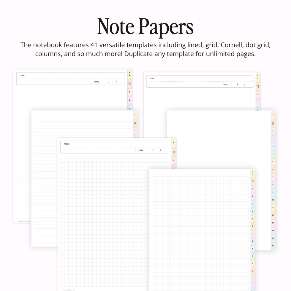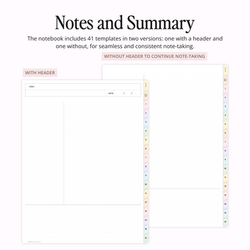 Introducing the Pastel Student Digital Notebook with 41 templates (each with and without headers for seamless note-taking) and 16 subject sections—perfect for customizing to your academic or personal needs. Note templates include lined, grid, dot grid, blank, Cornell notes, two-column, three-column, and more. It also features functional student inserts like a To-Do List, Weekly Tracker, Progress Tracker, Study Schedule, Mind Map, Chapter Summary, and Daily Tasks to support your digital planning.
